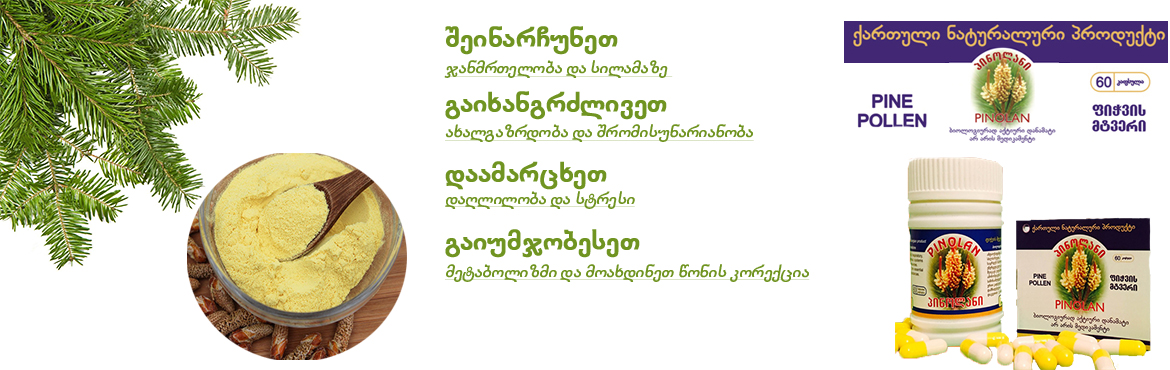 - 60 ცალი - 155 მ/გ ბორჯომის ნაკრძალის ფიჭვის ყვავილის მტვერით დოზირებული კაფსულა.